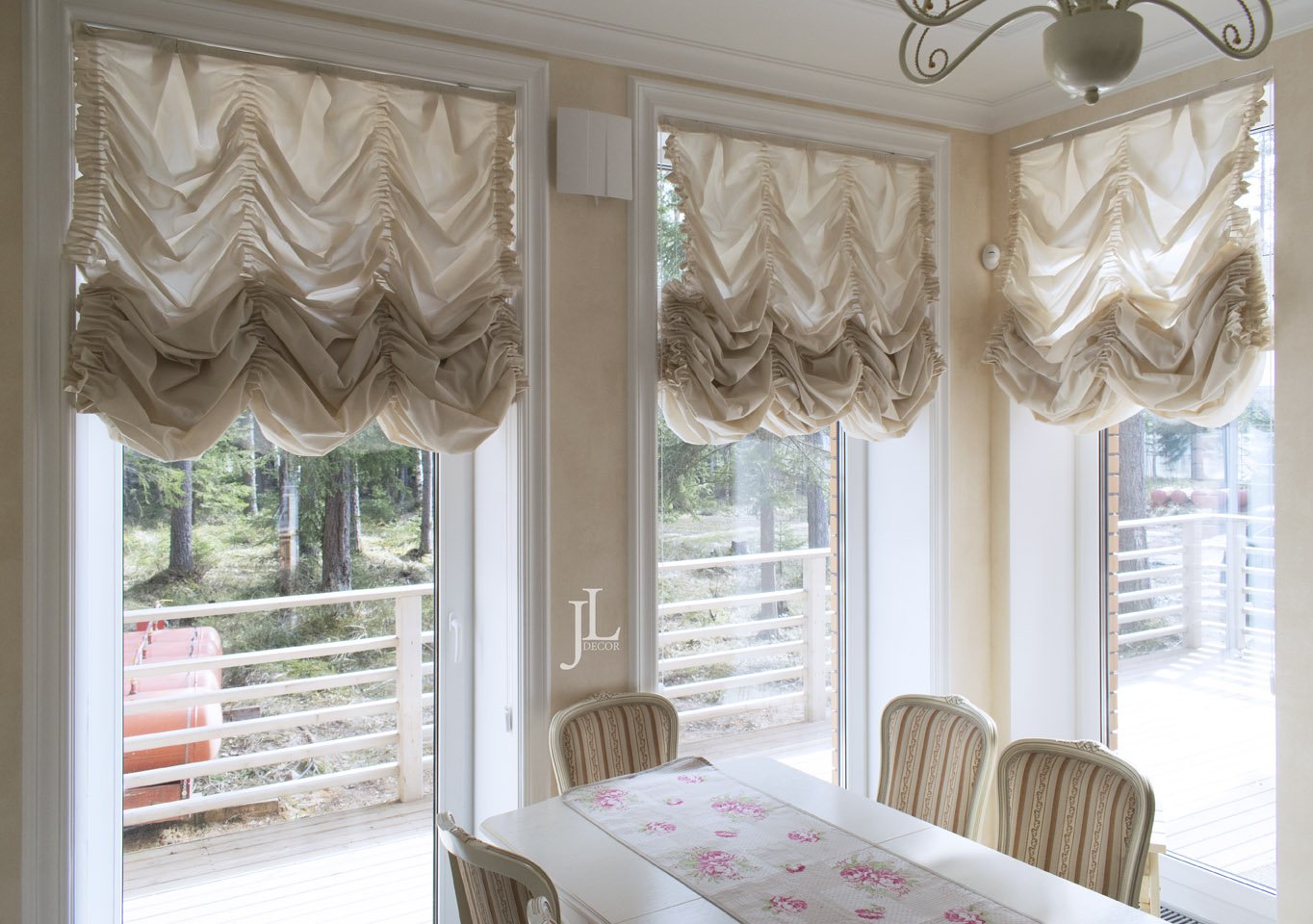 Чаще всего с портьерами используются легкие прозрачные и полупрозрачные гардины (занавески), создавая классический оконный ансамбль. Кроме того, с ними хорошо сочетаются римские и рулонные шторы.